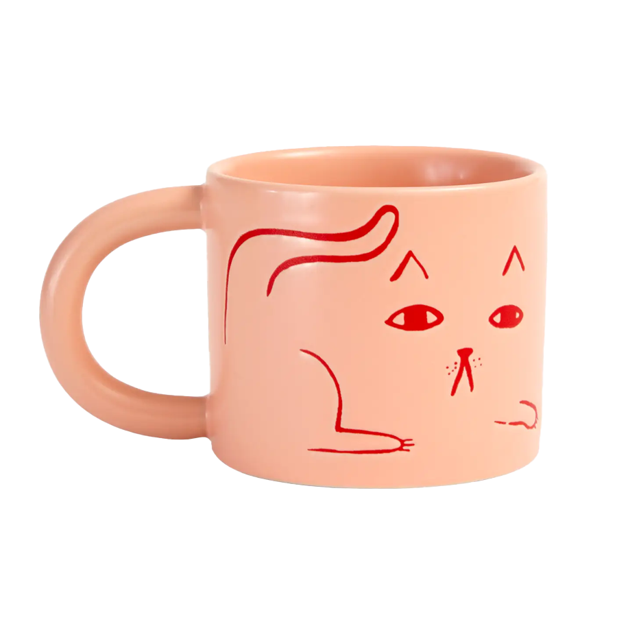 Fancy a brew? This pink and red ceramic mug is gorgeously sturdy and tactile, with a debossed image of a friendly cat on two sides. Perfect to warm your hands on while gazing out of a window.